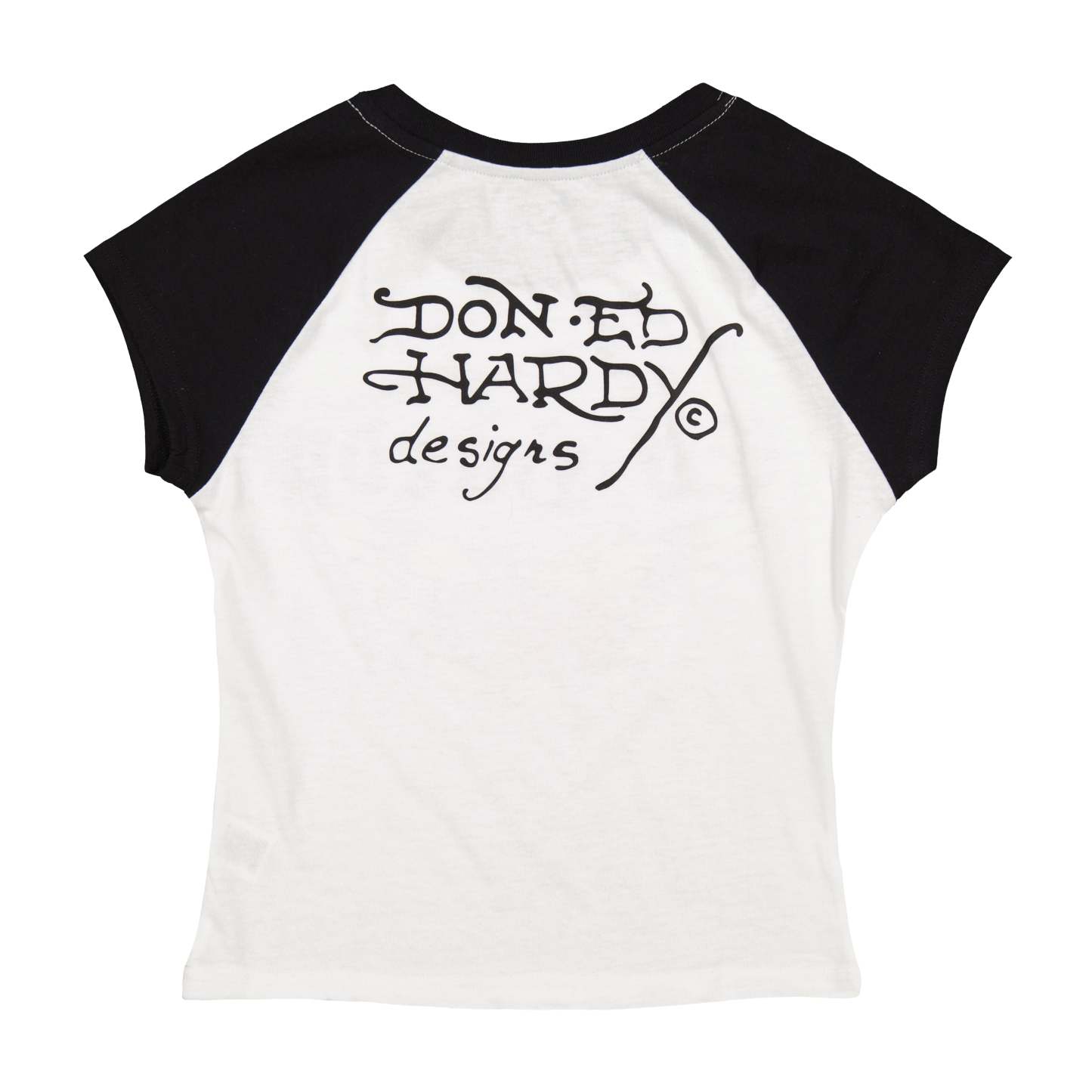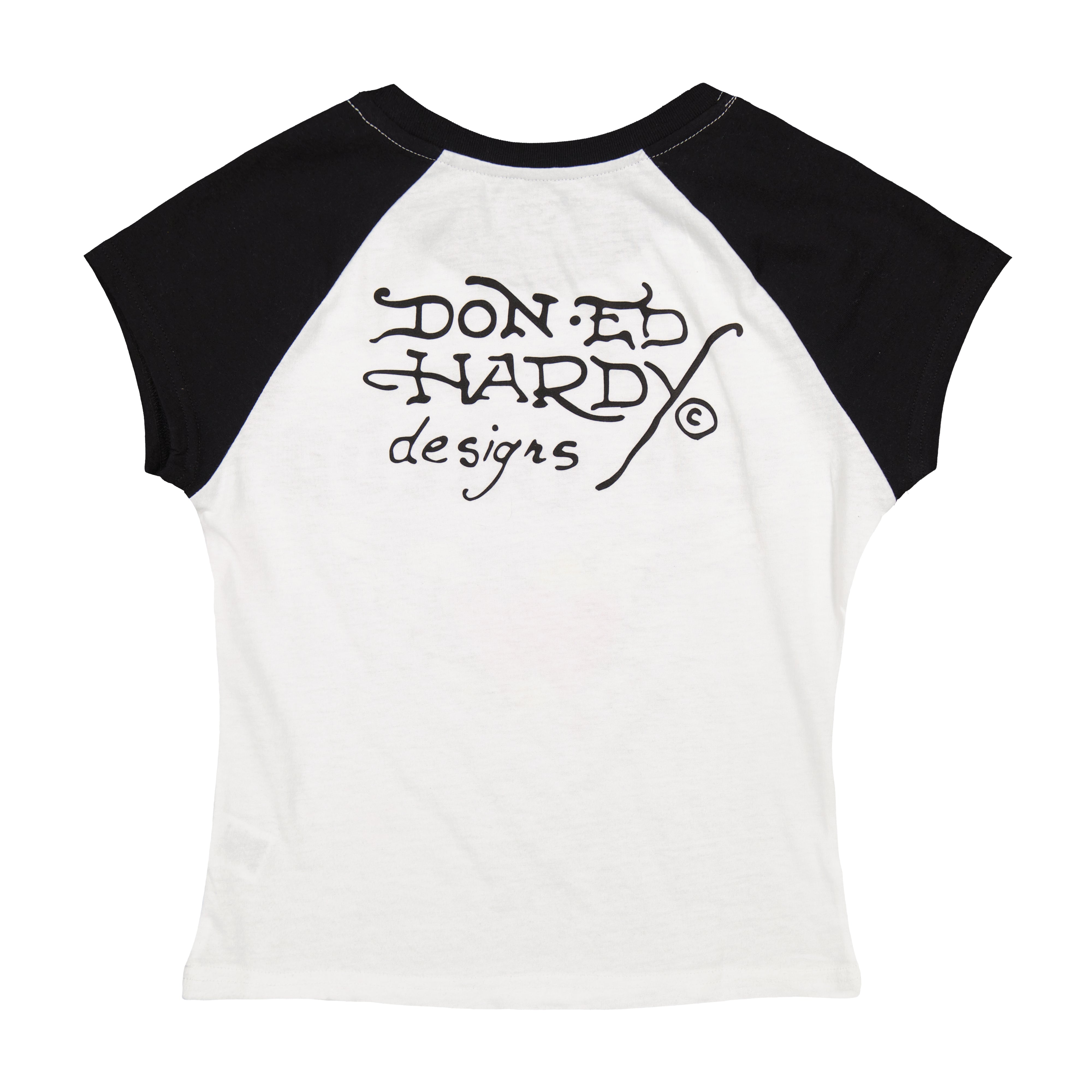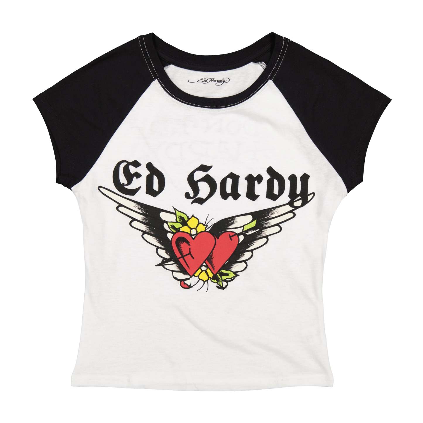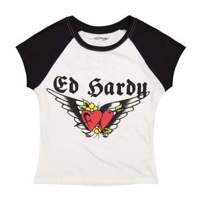 Cap sleeve raglan fitted tee cropped at the waist. Features an archival heart wings graphic, and complete with signature Ed Hardy logos on front and back.