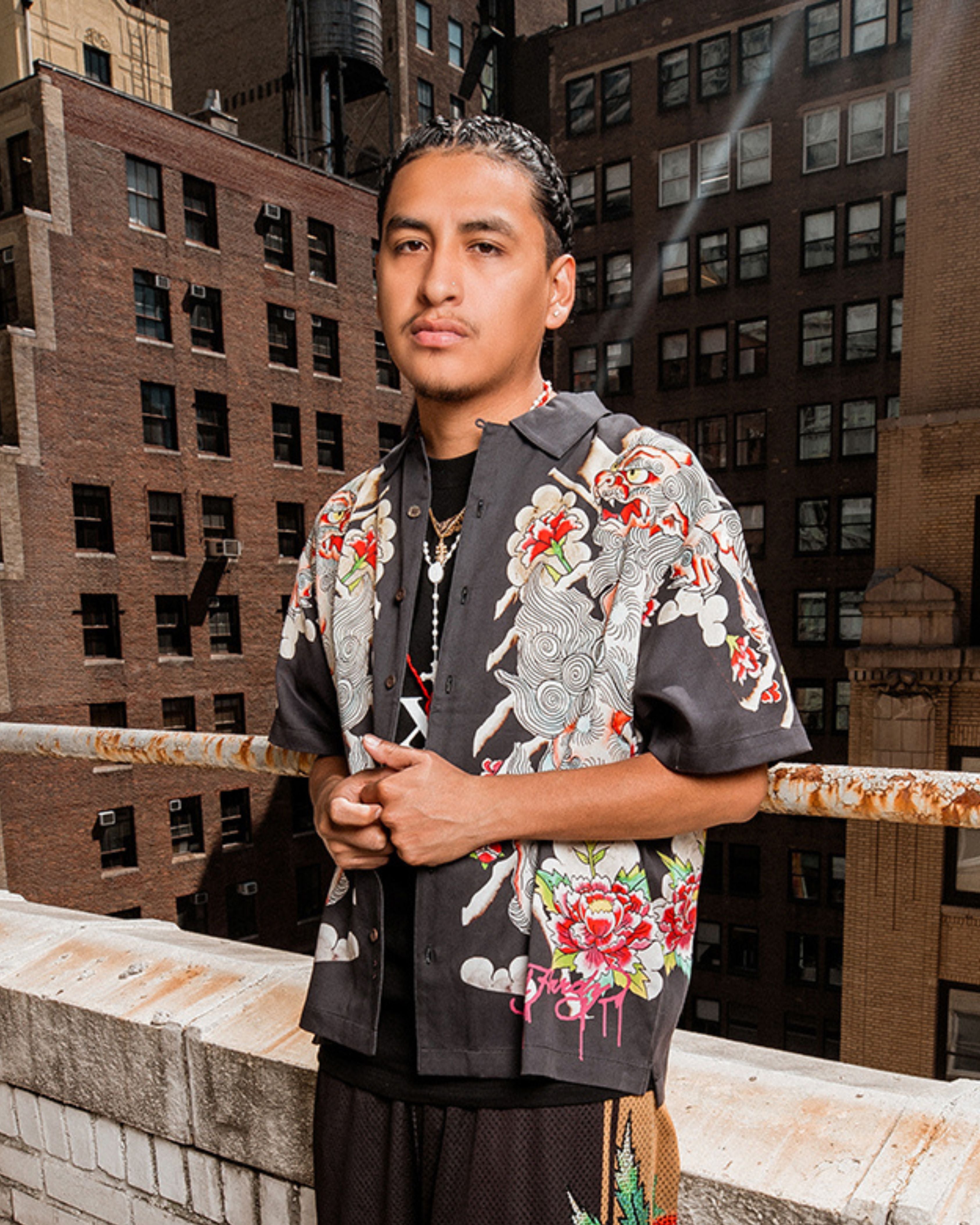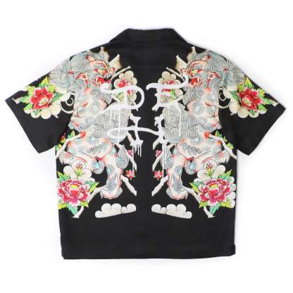 This luxury boxy camp shirt is constructed from a Lyocell twill fabric. A unique piece complete with sublimation panel printing and coconut buttons. Featuring exclusive Ed Hardy Japanese lion art on chest and sleeve.