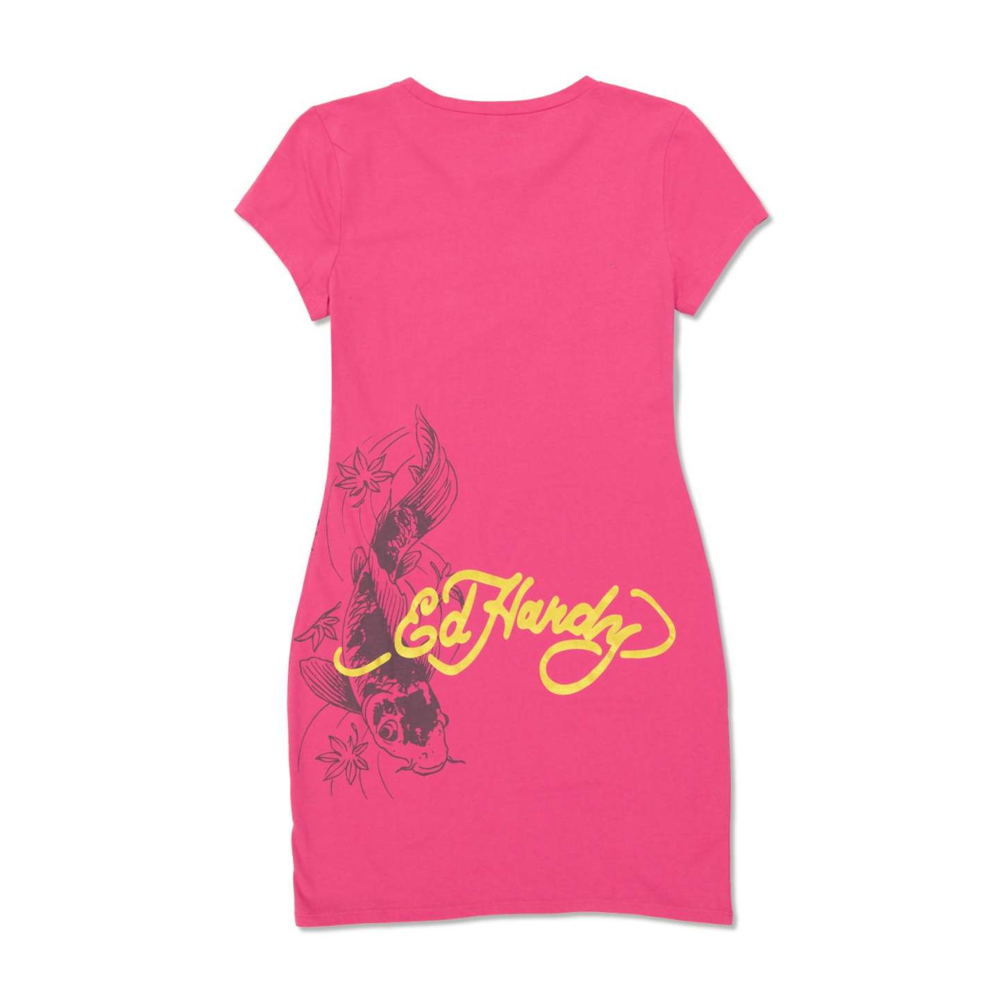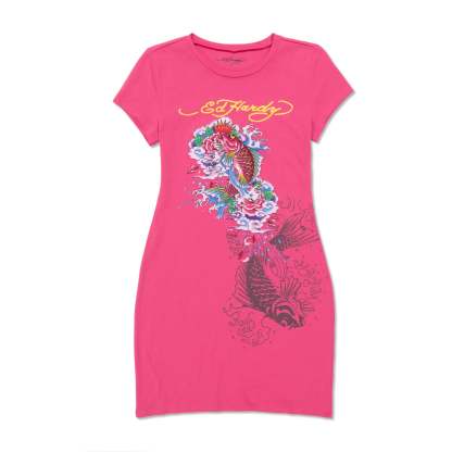The Koi Fish Baby Tee Short Sleeve Dress in vibrant hot pink is a celebration of bold and vivid fashion. With a striking koi fish print on the front and a silhouette koi print adorned with the iconic Ed Hardy logo on the back, this dress is a visual masterpiece.