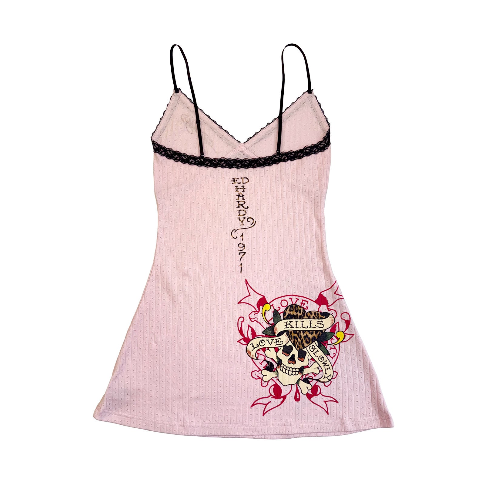 This baby pink pointelle nightie is delicate with an edge. Features iconic LKS graphics and several archival logos. Complete with black lace and adjustable straps.
