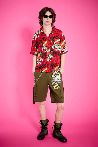 100% rayon woven camp shirt featuring an allover LKS skull collage print in red.